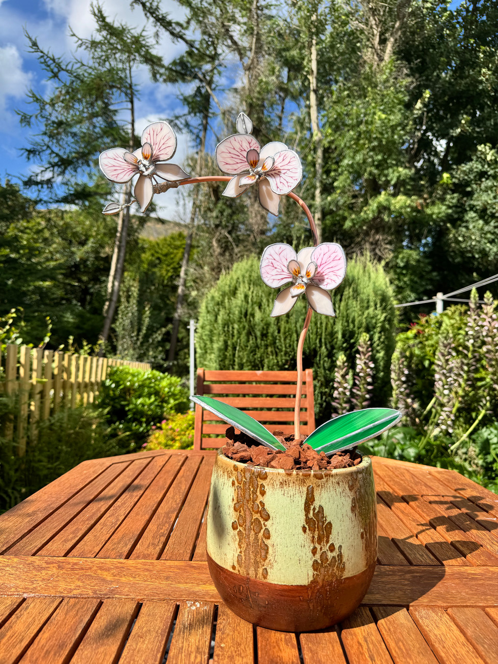 The project features a collection of stunning orchid flowers and buds, created using the traditional tiffany foiling method along with the use of glass painting to replicate the richness of the petals, highlighting the skill and craftsmanship of the artists involved. The additional challenges of ensuring the weight of the floral stem were counterbalanced perfectly with the pot and the stability of each component made this project incredibly exciting and rewarding to complete.